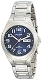Orologio casual, movimento al quarzo giapponese, lucido silver-tone spada mani con accenti luminosi e secondi continui, Applied lucido silver-tone numeri arabi con indici bianchi, doppio pannello di day-and-date analog apertura alle 03:00, spazzolato / lucido bracciale in acciaio silver-tone con collegamenti regolabili e push-button-chiusura, lucido silver-tone, lunetta in ottone spazzolato / lucido silver-tone cassa rotonda in ottone, corona in acciaio strutturato, fondello in acciaio, vetro minerale, 50 meters/165 piedi